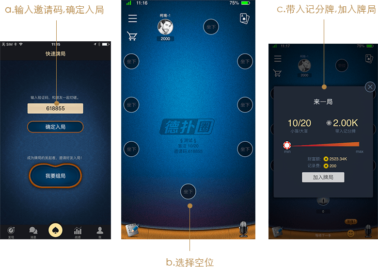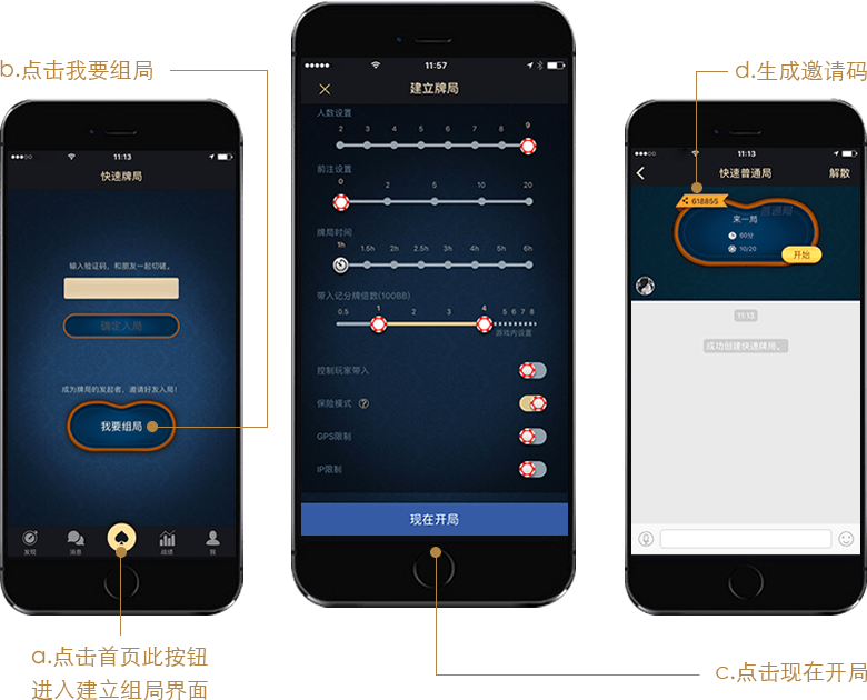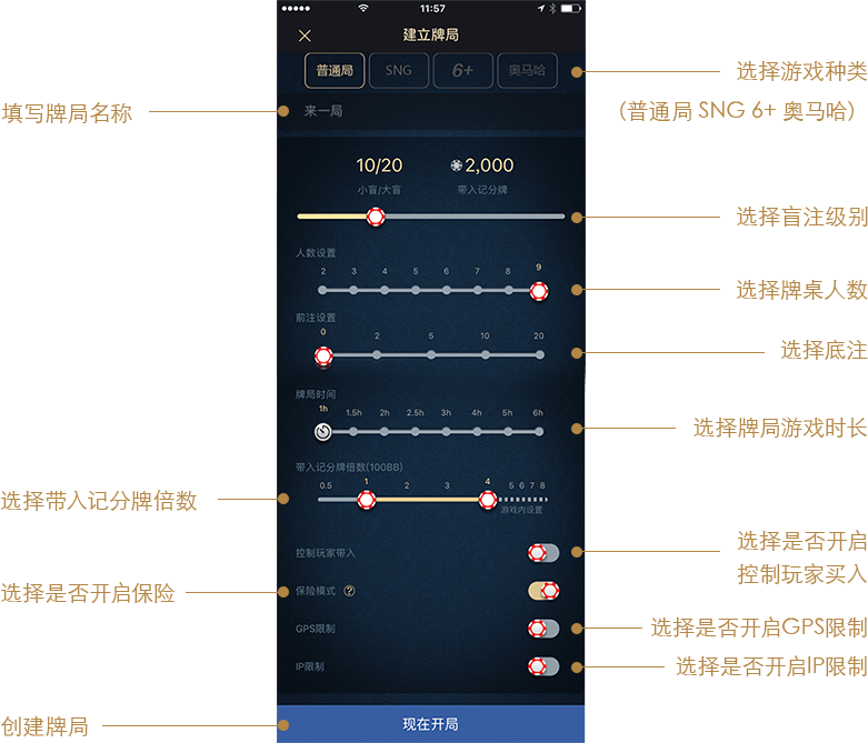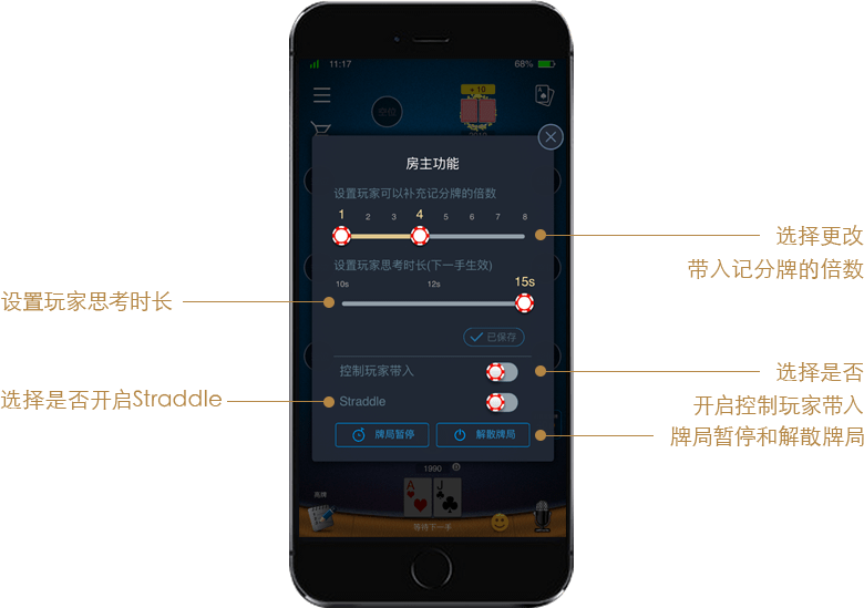 踢出牌局——使用此功能,在此轮手牌结束后,该玩家被踢出出局,出局后,玩家不可再次进入该牌局游戏。
